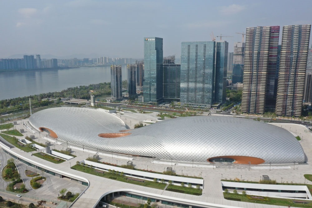 2021年8月2日拍攝的杭州奧體中心場(chǎng)館群(無人機(jī)照片)。新華社發(fā)(杭州亞組委供圖)