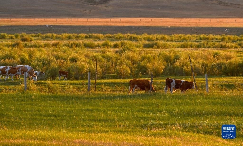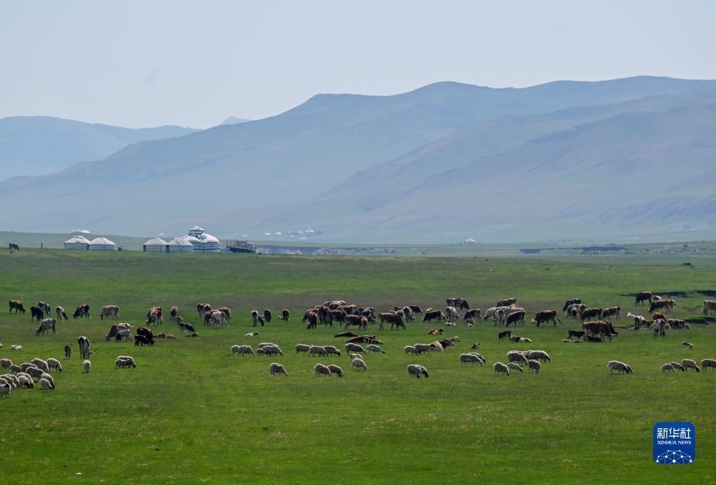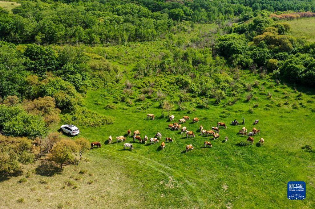 夏日,內(nèi)蒙古阿魯科爾沁草原綠意盎然,牛羊在草原上覓食,景色如畫。新華社記者 連振 攝