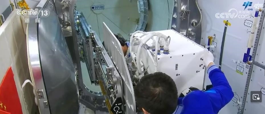 這是3位航天員正在夢(mèng)天實(shí)驗(yàn)艙進(jìn)行空間輻射生物學(xué)暴露實(shí)驗(yàn)裝置出艙工作,航天員將載荷安裝到載荷轉(zhuǎn)移機(jī)構(gòu)。載荷出艙前,航天員在反復(fù)仔細(xì)檢查,隨后,關(guān)閉夢(mèng)天實(shí)驗(yàn)艙貨物氣閘艙艙門。通過該裝置開展空間粒子輻射等環(huán)境要素,對(duì)樣本材料生物學(xué)效應(yīng)的研究,為科學(xué)實(shí)驗(yàn)生物樣品提供生命保障。