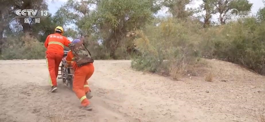 因?yàn)楣茏o(hù)面積大,中午護(hù)林員只能用攜帶的干糧充饑。為了近距離查看胡楊樹的情況,他們大多數(shù)時(shí)候要在林中小路里穿梭。有的地方路況不好,就需要推著摩托車行走,難免遇到連人帶車陷進(jìn)沙地里的情況,要格外小心。