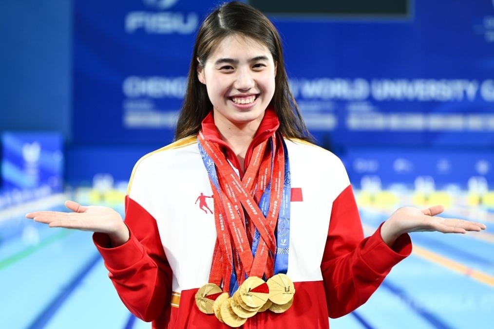 8月7日,張雨霏展示她獲得的九枚大運會金牌。新華社記者 吳剛 攝