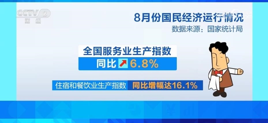 服務業(yè)較快增長,8月份,全國服務業(yè)生產指數(shù)同比增長6.8%。其中,住宿和餐飲業(yè)依然保持較快增長,生產指數(shù)同比增幅達到16.1%。