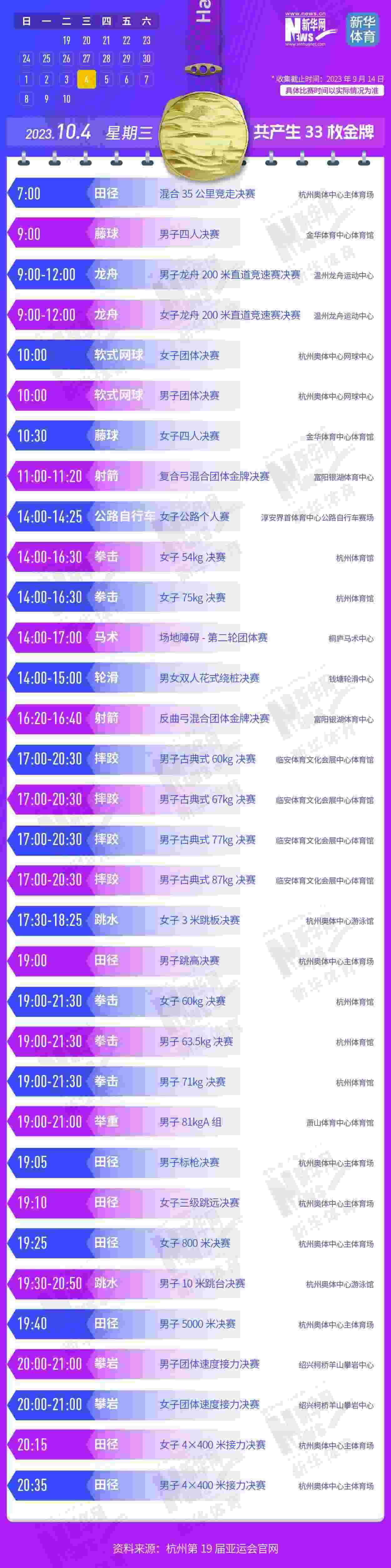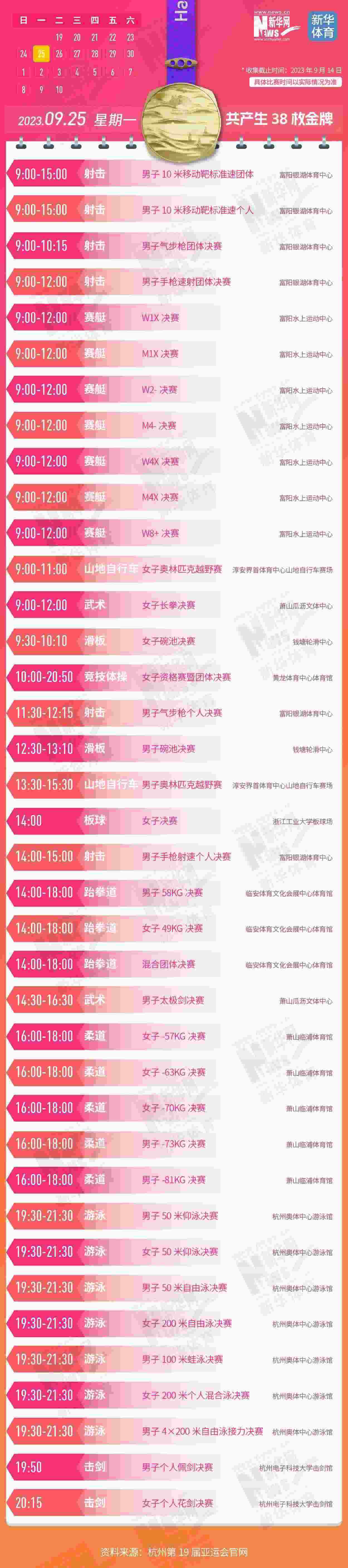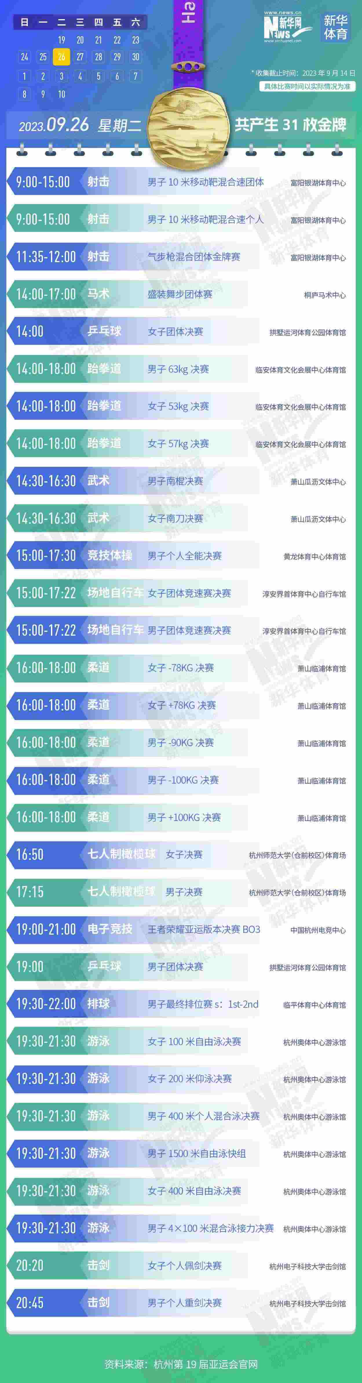 杭州第19屆亞運(yùn)會(huì)即將開(kāi)幕。本屆亞運(yùn)會(huì)將產(chǎn)生481枚金牌,快收藏這份金牌賽事日歷,助你精準(zhǔn)觀賽!