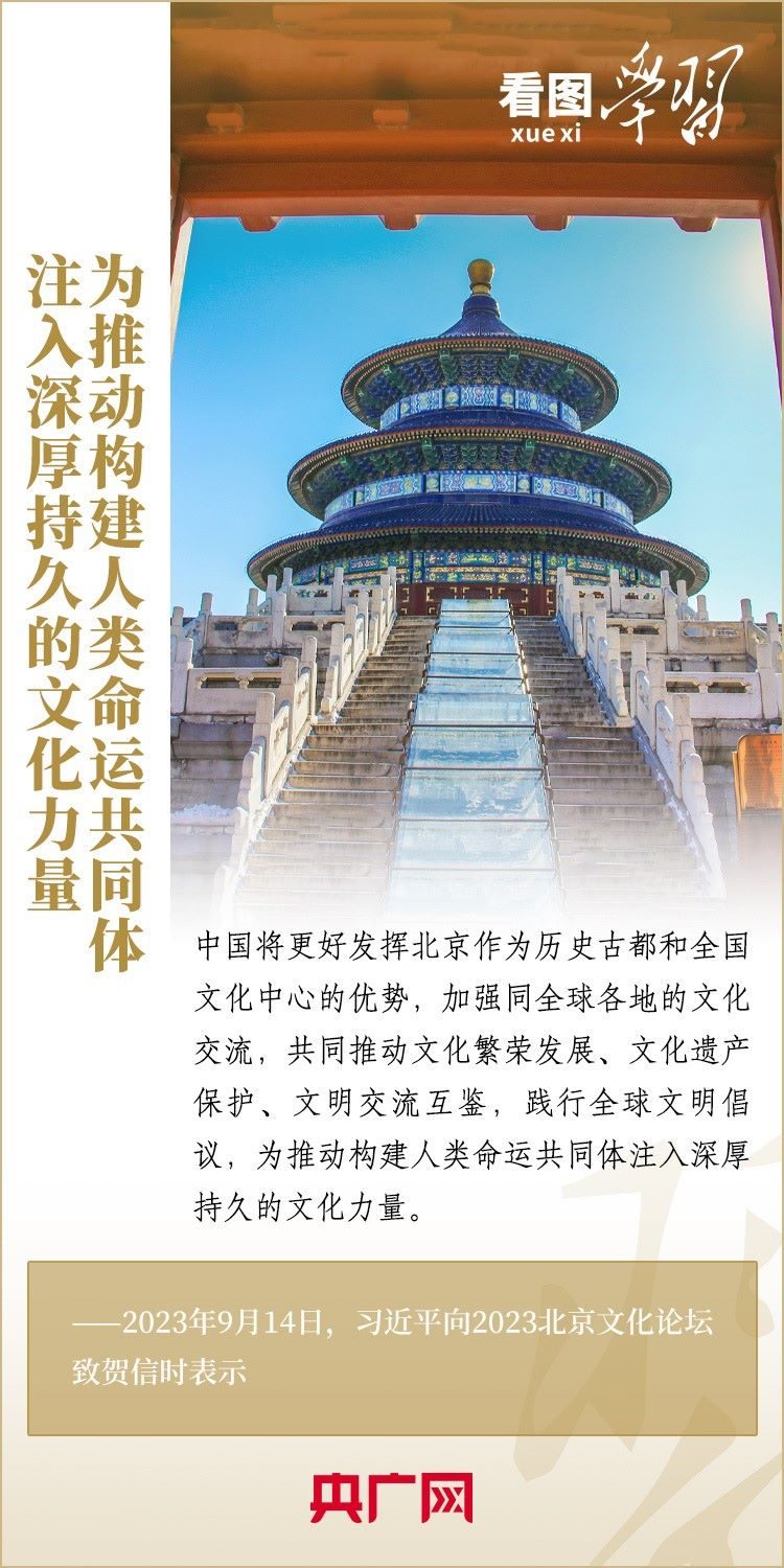 9月14日,以“傳承優(yōu)秀文化 促進(jìn)交流合作”為年度主題的2023北京文化論壇在北京開(kāi)幕。習(xí)近平主席向論壇致賀信表示,中國(guó)將更好發(fā)揮北京作為歷史古都和全國(guó)文化中心的優(yōu)勢(shì),加強(qiáng)同全球各地的文化交流,共同推動(dòng)文化繁榮發(fā)展、文化遺產(chǎn)保護(hù)、文明交流互鑒,踐行全球文明倡議,為推動(dòng)構(gòu)建人類(lèi)命運(yùn)共同體注入深厚持久的文化力量。