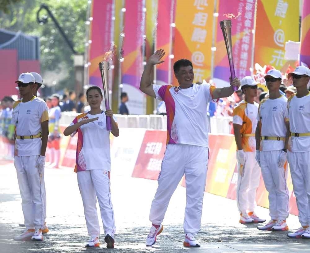 ↑火炬手鄭方(右)和施金仙在火炬?zhèn)鬟f中。
