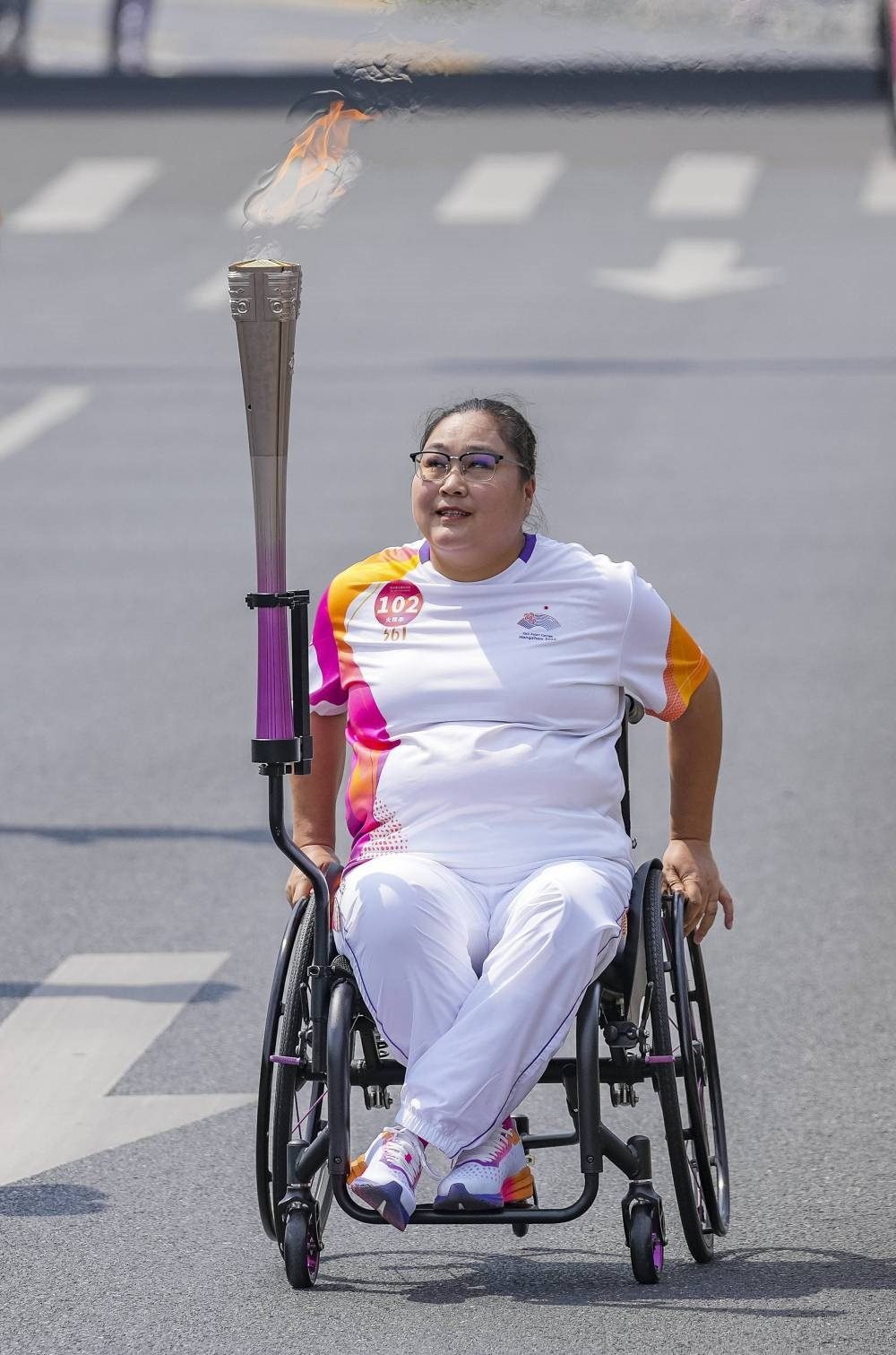 ↑火炬手董群英在火炬?zhèn)鬟f中。