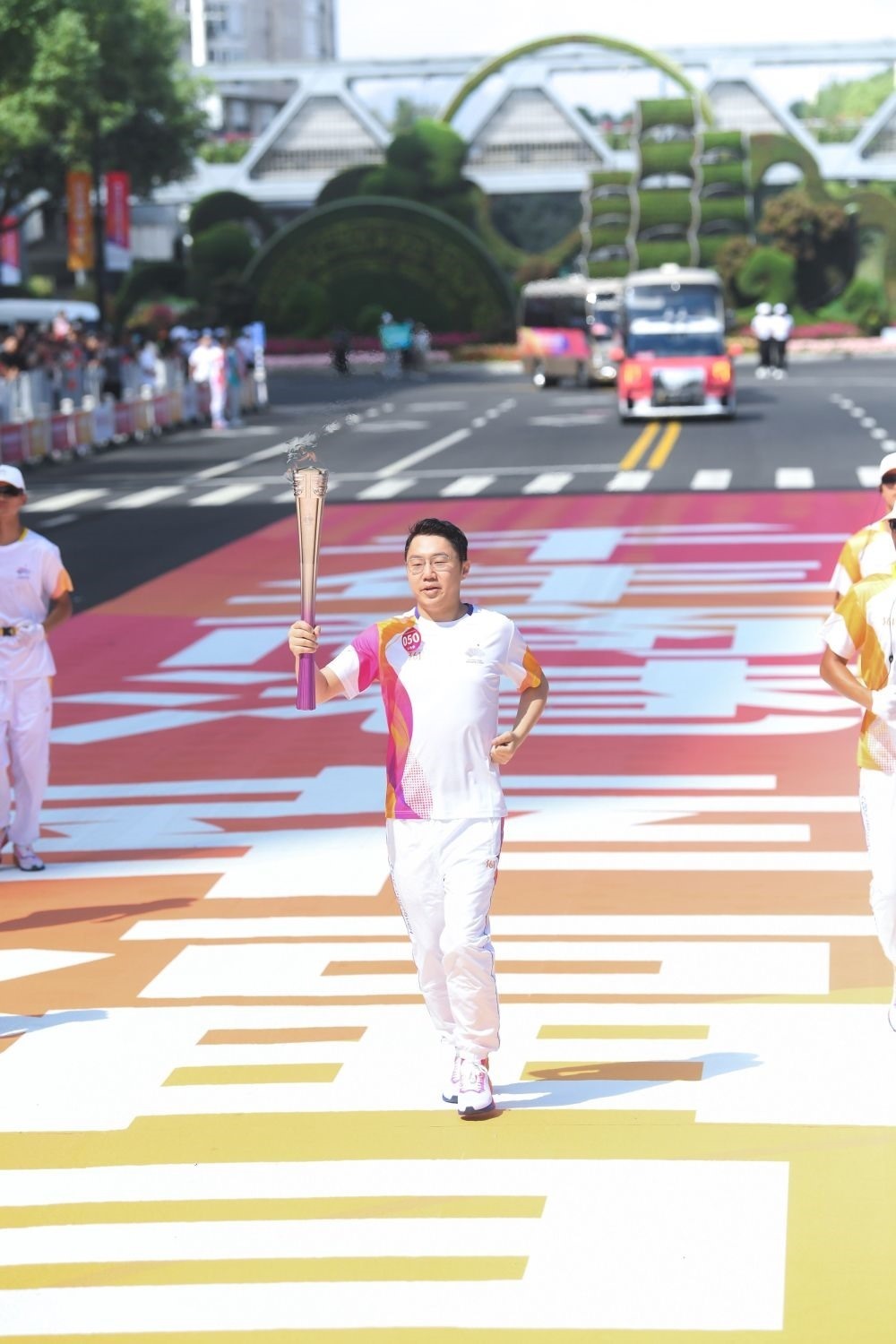 ↑火炬手吳一銳在火炬?zhèn)鬟f中。