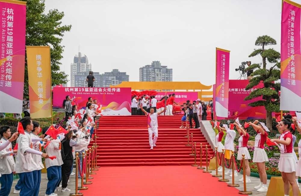↑這是杭州亞運(yùn)會(huì)火炬?zhèn)鬟f金華站起跑儀式現(xiàn)場(chǎng)。