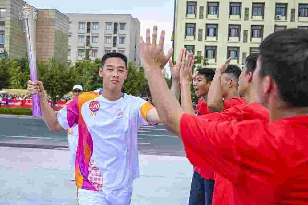 ↑火炬手謝波在火炬?zhèn)鬟f中。