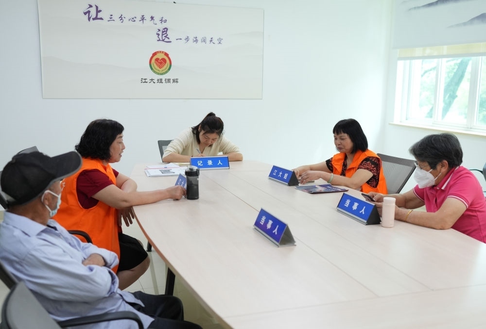在浙江紹興諸暨市暨陽街道江新社區(qū)“江大姐”調解室,兩名調解員在為群眾進行調解。這個調解工作室成員主要由女性組成,為周邊居民調解鄰里、家庭矛盾(2023年5月26日攝)。