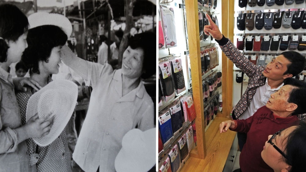 ↑拼版照片,左圖為:義烏小商品市場(chǎng)第一代經(jīng)營(yíng)戶馮愛(ài)倩(右)在向顧客推銷遮陽(yáng)帽(攝于上個(gè)世紀(jì)80年代);右圖為:2018年10月25日,78歲的馮愛(ài)倩(中)在傾聽她的孫子、義烏國(guó)際商貿(mào)城經(jīng)營(yíng)戶楊帆(上)介紹他自產(chǎn)自銷的新款襪子。楊帆大學(xué)畢業(yè)后當(dāng)上了父親創(chuàng)辦的襪業(yè)公司的總經(jīng)理。