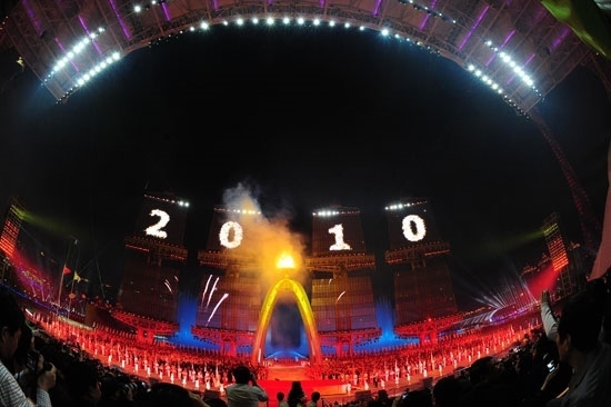 2010年11月12日,廣州,第十六屆亞運會開幕式在海心沙島隆重舉行,圖為主火炬點火儀式。視覺中國供圖
