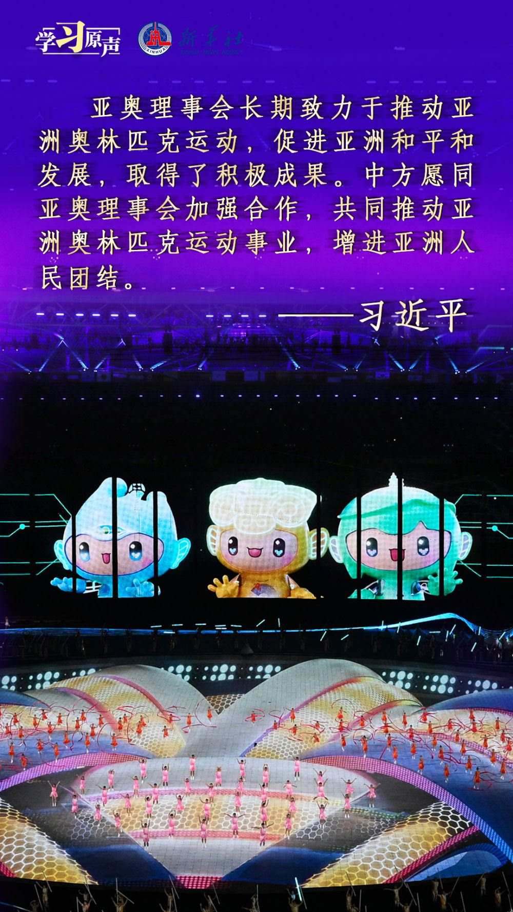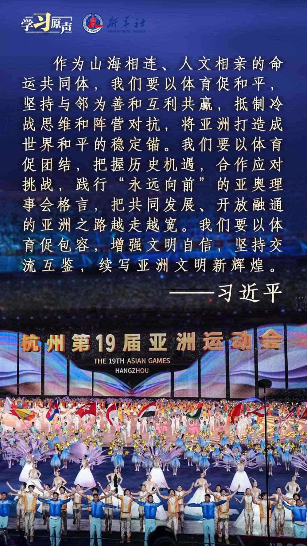 秋分時(shí)節(jié),舉世矚目的杭州第十九屆亞洲運(yùn)動(dòng)會(huì)隆重開幕?!皝喼捱\(yùn)動(dòng)會(huì)承載著亞洲人民對和平、團(tuán)結(jié)、包容的美好向往?!绷?xí)近平主席在杭州第十九屆亞洲運(yùn)動(dòng)會(huì)開幕式歡迎宴會(huì)上的致辭,傳遞著熱情友好的情誼,宣示了新時(shí)代中國推動(dòng)亞洲大家庭團(tuán)結(jié)合作的堅(jiān)定決心,為促進(jìn)亞洲和國際奧林匹克運(yùn)動(dòng)發(fā)展、共建亞洲命運(yùn)共同體注入強(qiáng)大信心與力量。