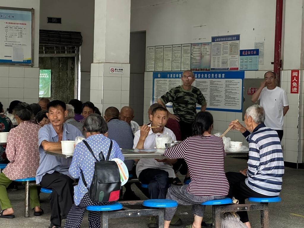 長灘初級中學安置點群眾正在用午飯。新華社記者李曉婷 攝