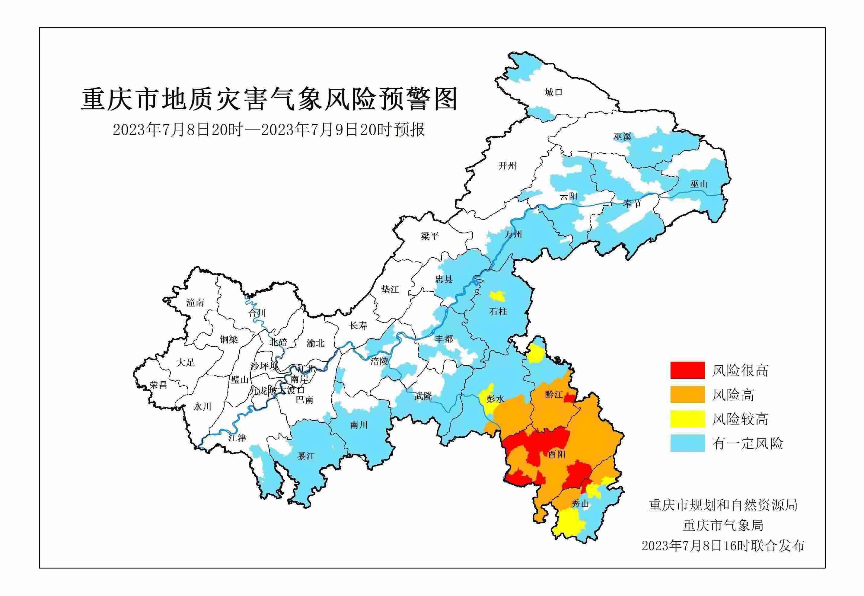 7月8日16時,重慶市規(guī)劃和自然資源局、重慶市氣象局聯(lián)合發(fā)布全市地質(zhì)災(zāi)害氣象風險預警。
