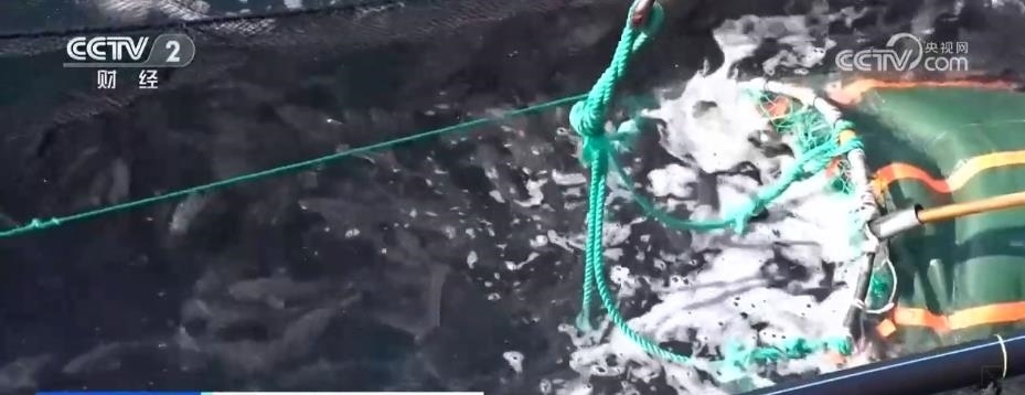 在煙臺(tái)長(zhǎng)島南隍城海域,隨著經(jīng)海系列深水網(wǎng)箱里魚(yú)類的成熟,一場(chǎng)在大海上的收獲正在進(jìn)行。起降機(jī)將一個(gè)個(gè)裝滿魚(yú)兒的巨大網(wǎng)兜轉(zhuǎn)移到運(yùn)輸船上,2.5萬(wàn)尾近4萬(wàn)斤的成品黑鲪魚(yú),將從這里銷往全國(guó)各地。
