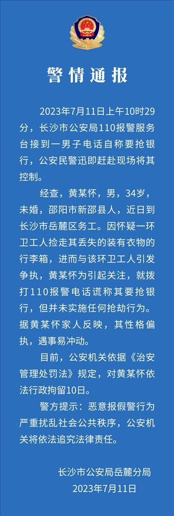 ·一人因與環(huán)衛(wèi)工人引發(fā)爭執(zhí),為引起關(guān)注,撥打110報(bào)警電話謊稱要搶銀行。長沙警方通報(bào),對其依法行政拘留10日。
