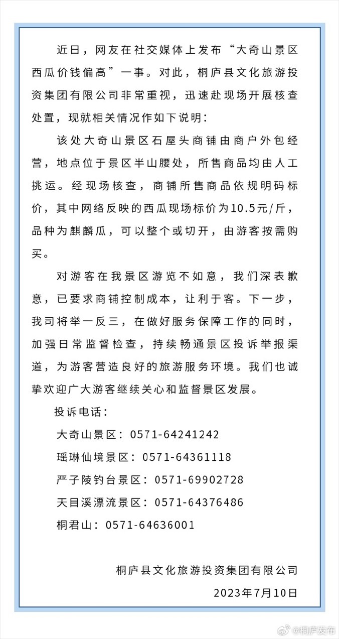 ·一游客反映大奇山景區(qū)一個(gè)西瓜賣200多元。10日,桐廬文旅集團(tuán)致歉稱,商品均由人工挑運(yùn),對游客在景區(qū)游覽不如意深表歉意,已要求商鋪控制成本,讓利于客。