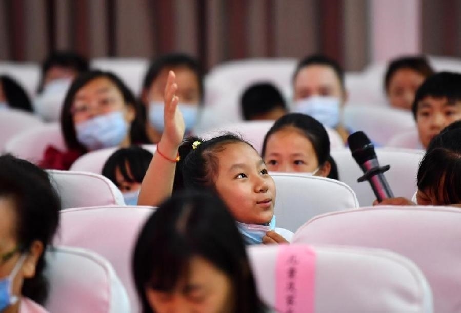 在天津市北辰區(qū)青光村黨群服務(wù)中心,學(xué)生在一場安全教育活動(dòng)上回答問題。新華社記者 李然 攝
