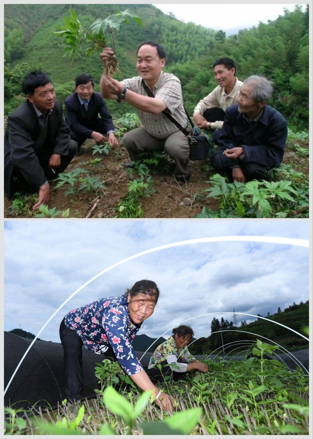 拼版照片:上圖為浙江省中藥研究所有限公司正高級(jí)工程師俞旭平(中)向淳安縣下姜村村民傳授中藥材種植技能(資料照片);下圖為7月3日,村民在淳安縣下姜村一片種植基地查看中藥材扦插苗的生長(zhǎng)情況(新華社記者翁忻旸攝)。新華社發(fā)