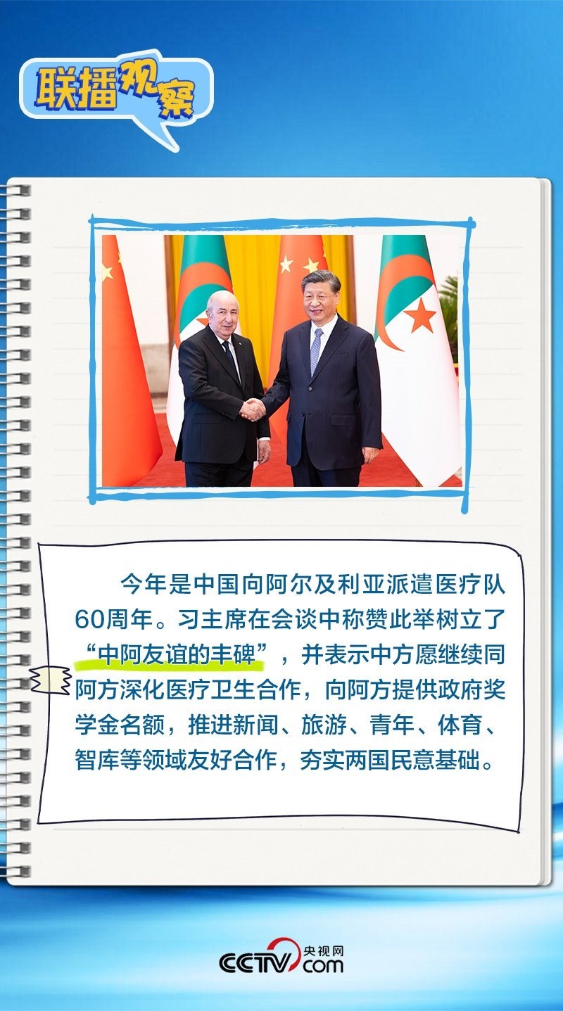 會談中,習(xí)主席特別提到,今年是中國向阿爾及利亞派遣醫(yī)療隊60周年,并稱贊此舉樹立了“中阿友誼的豐碑”。中阿傳統(tǒng)友誼深厚,兩國始終相互尊重、平等相待、彼此支持,締造了一段段友好交往的佳話。