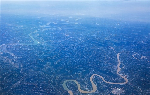 成都,兩條河流一條呈黃色,一條現(xiàn)藍色,涇渭分明、蜿蜒曲折,似一青一黃兩條巨龍橫臥大地。