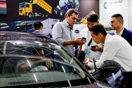 △今年4月15日,采購商在廣交會(huì)新設(shè)置的新能源及智能網(wǎng)聯(lián)汽車展區(qū)了解中國新能源汽車產(chǎn)品。