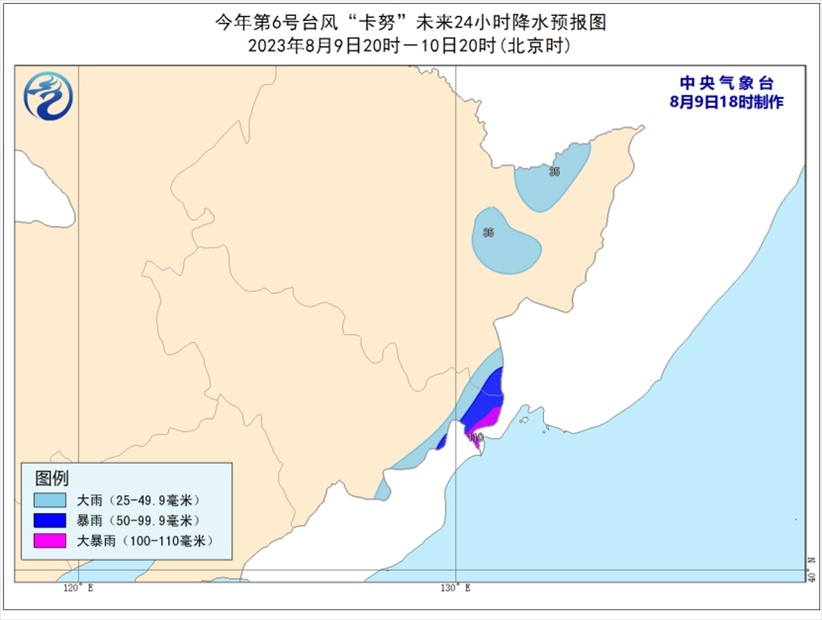 9日20時至10日20時,吉林東北部、黑龍江東部將有大到暴雨,局部有大暴雨(100-110毫米)。