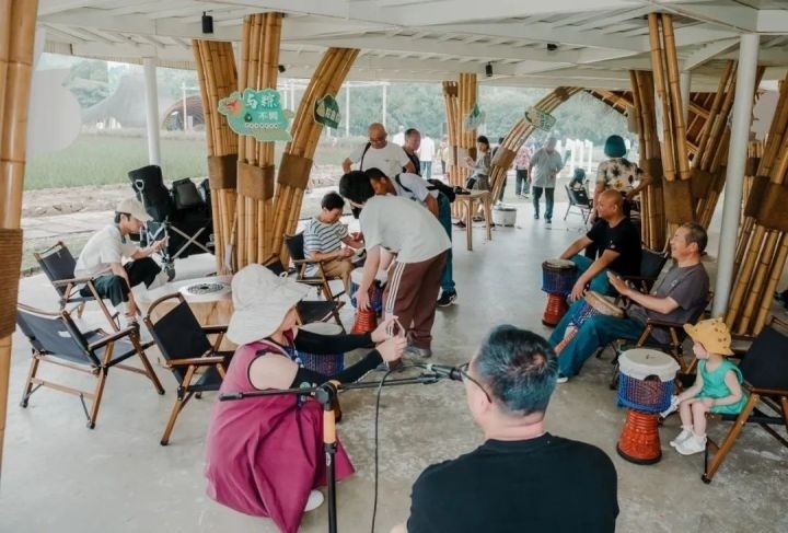余村游客在竹建筑下體驗非洲鼓