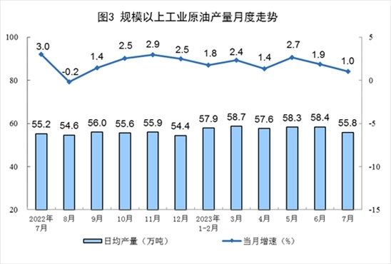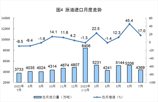 原油產(chǎn)量小幅增加,進(jìn)口保持較快增長(zhǎng)。7月份,生產(chǎn)原油1731萬(wàn)噸,同比增長(zhǎng)1.0%,增速比6月份放緩0.9個(gè)百分點(diǎn),日均產(chǎn)量55.8萬(wàn)噸。進(jìn)口原油4369萬(wàn)噸,同比增長(zhǎng)17.0%,增速比6月份回落28.4個(gè)百分點(diǎn)。