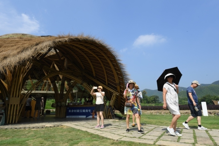 游客在安吉余村參觀用當?shù)厥a(chǎn)的竹材料建造的建筑。圖片來源:新華社