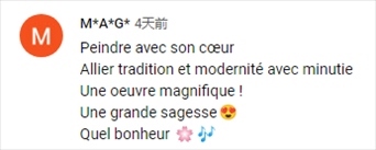 法語(yǔ)網(wǎng)友M*A*G*:“用心作畫(huà),將傳統(tǒng)與現(xiàn)代結(jié)合,華麗的作品,偉大的智慧,這是多么幸福的一件事?。 ?/p>