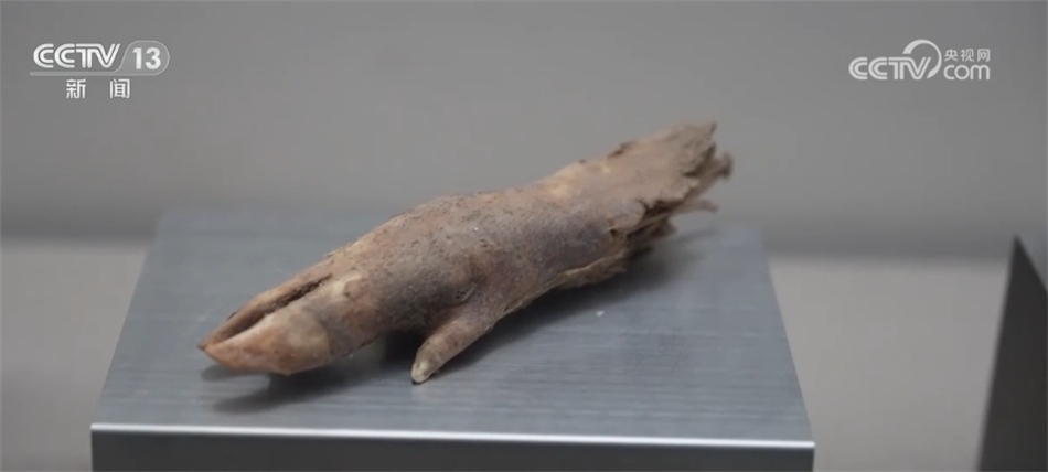 嘉峪關(guān)市紅領(lǐng)巾講解員 辛宇軒:這個(gè)是漢代豬蹄,是守衛(wèi)邊疆士卒們留下來的遺存之物,距今2000余年,是極為難得的長城文物。我們可以看得出來,它的骨架、腳趾保存都是相對(duì)完好的,這是野豬的豬蹄,我們這邊氣候干燥,所以就不會(huì)把它給腐蝕掉。