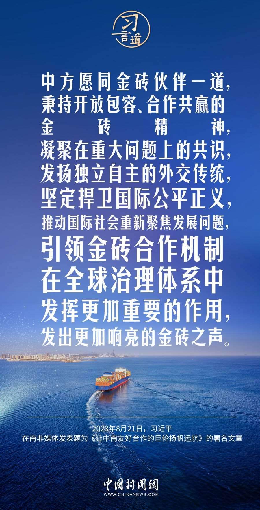 8月21日,在赴約翰內(nèi)斯堡出席金磚國家領(lǐng)導(dǎo)人第十五次會晤并對南非進行國事訪問之際,國家主席習(xí)近平在南非《星報》、《開普時報》、《水星報》和南非獨立媒體網(wǎng)站發(fā)表題為《讓中南友好合作的巨輪揚帆遠航》的署名文章。習(xí)近平指出——