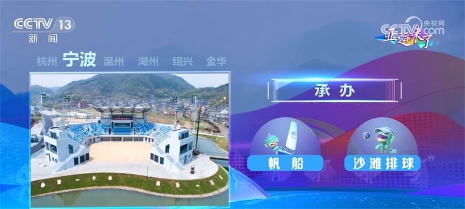 寧波設(shè)2個(gè)場館和1個(gè)亞運(yùn)分村,承辦帆船和沙灘排球項(xiàng)目;溫州設(shè)3個(gè)場館和1個(gè)亞運(yùn)分村,承辦足球小組賽和龍舟項(xiàng)目;湖州設(shè)2個(gè)競賽場館,承辦排球和三人制籃球項(xiàng)目;紹興設(shè)4個(gè)場館,承辦籃球、排球、攀巖、棒壘球項(xiàng)目;金華設(shè)3個(gè)場館和1個(gè)亞運(yùn)分村,承辦足球小組賽和藤球項(xiàng)目。