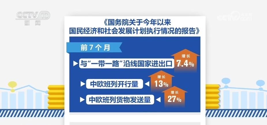 報告顯示,共建“一帶一路”持續(xù)推進(jìn)。鞏固拓展與重點共建國家和國際組織的務(wù)實合作,進(jìn)一步強(qiáng)化風(fēng)險防控,前7個月與“一帶一路”沿線國家進(jìn)出口增長7.4%,中歐班列開行量、貨物發(fā)送量分別增長13%、27%。