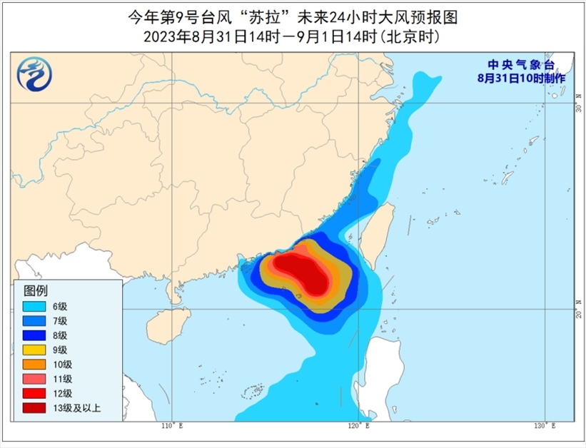 央視網(wǎng)消息:中央氣象臺8月31日10時繼續(xù)發(fā)布臺風(fēng)紅色預(yù)警,今年第9號臺風(fēng)“蘇拉”(超強臺風(fēng)級)的中心今天(31日)上午10點鐘位于廣東汕尾東南方向大約335公里的南海東北部海面上,就是北緯21.0度、東經(jīng)118.0度,中心附近最大風(fēng)力有17級(58米/秒),中心最低氣壓為925百帕,七級風(fēng)圈半徑250-280公里,十級風(fēng)圈半徑130公里,十二級風(fēng)圈半徑70公里。