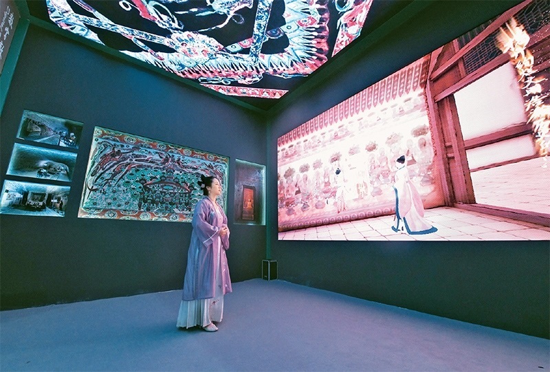 圖為2023年6月8日,一名身著傳統(tǒng)服飾的觀眾在第十九屆中國(guó)(深圳)國(guó)際文化產(chǎn)業(yè)博覽交易會(huì)甘肅展臺(tái)觀看數(shù)字敦煌展覽。 新華社記者 梁旭/攝