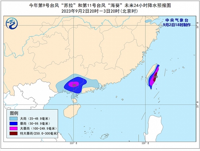 降水預(yù)報: 9月2日20時至3日20時,受“蘇拉”和“??庇绊?,廣西中南部、廣東西南部、臺灣島大部有大到暴雨,其中,廣西東南部、臺灣島東部等地部分地區(qū)有大暴雨,臺灣島東部局地有特大暴雨(250-300毫米)。