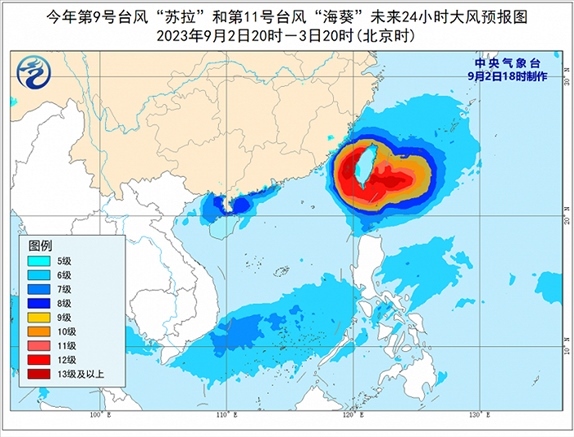 大風預(yù)報:9月2日20時至3日20時,受“蘇拉”影響,廣東中西部沿海、廣西南部沿海、海南島北部沿海、珠江口及澳門等地將有6-7級大風,南海西北部、北部灣東部和瓊州海峽將有8級、陣風9-10級的大風;受“海葵”影響,巴士海峽南部、臺灣海峽西部、東海南部及釣魚島附近海域、浙江南部沿海、福建中北部沿海、臺灣島沿海將有6-8級、陣風9-10級大風,巴士海峽北部、臺灣海峽東部、臺灣以東洋面及臺灣島南部沿海的風力有9-12級,陣風13-14級,“海葵”中心經(jīng)過的附近海面或地區(qū)的風力有13-16級,陣風17級。