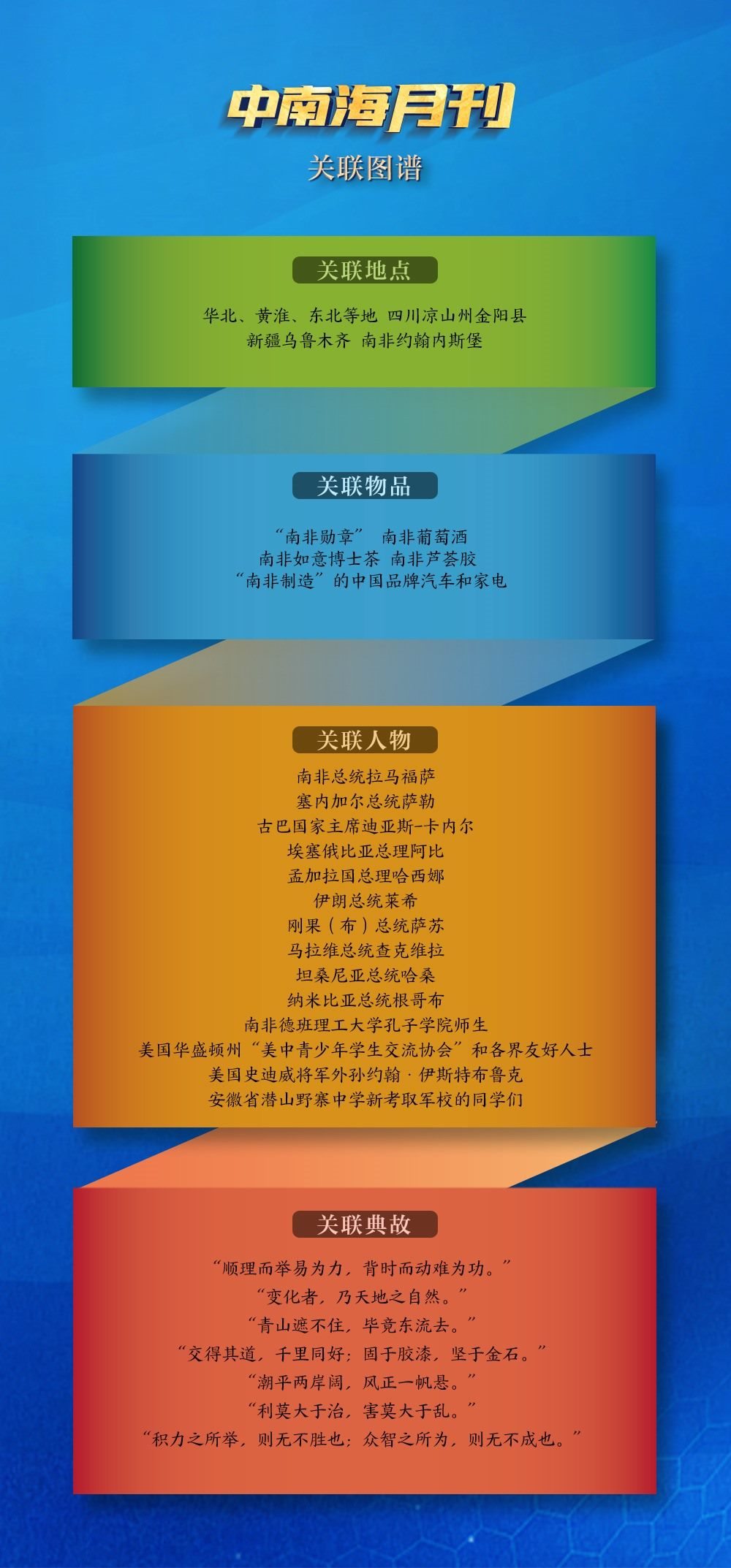 關(guān)聯(lián)物品“南非勛章”吸引了世界目光。8月22日,在南非比勒陀利亞總統(tǒng)府,拉馬福薩總統(tǒng)捧起一枚“南非勛章”,鄭重為習(xí)近平主席佩戴上。這是南非授予重要友好國(guó)家元首的最高級(jí)別勛章和最高榮譽(yù),也成為兩國(guó)“同志加兄弟”特殊友好關(guān)系的有力見(jiàn)證。