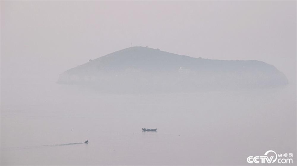 2023年9月3日清晨,大連,星海灣東部海域上空霧氣彌漫,島礁、漁船在霧中若隱若現(xiàn)。大連市氣象臺(tái)于當(dāng)日03時(shí)57分發(fā)布了海上大霧橙色預(yù)警信號(hào)。