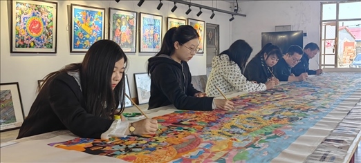 吉林省梨樹縣民間藝術(shù)家正在創(chuàng)作《關(guān)東七彩農(nóng)民畫、心系亞運(yùn)向未來》農(nóng)民畫。受訪者供圖