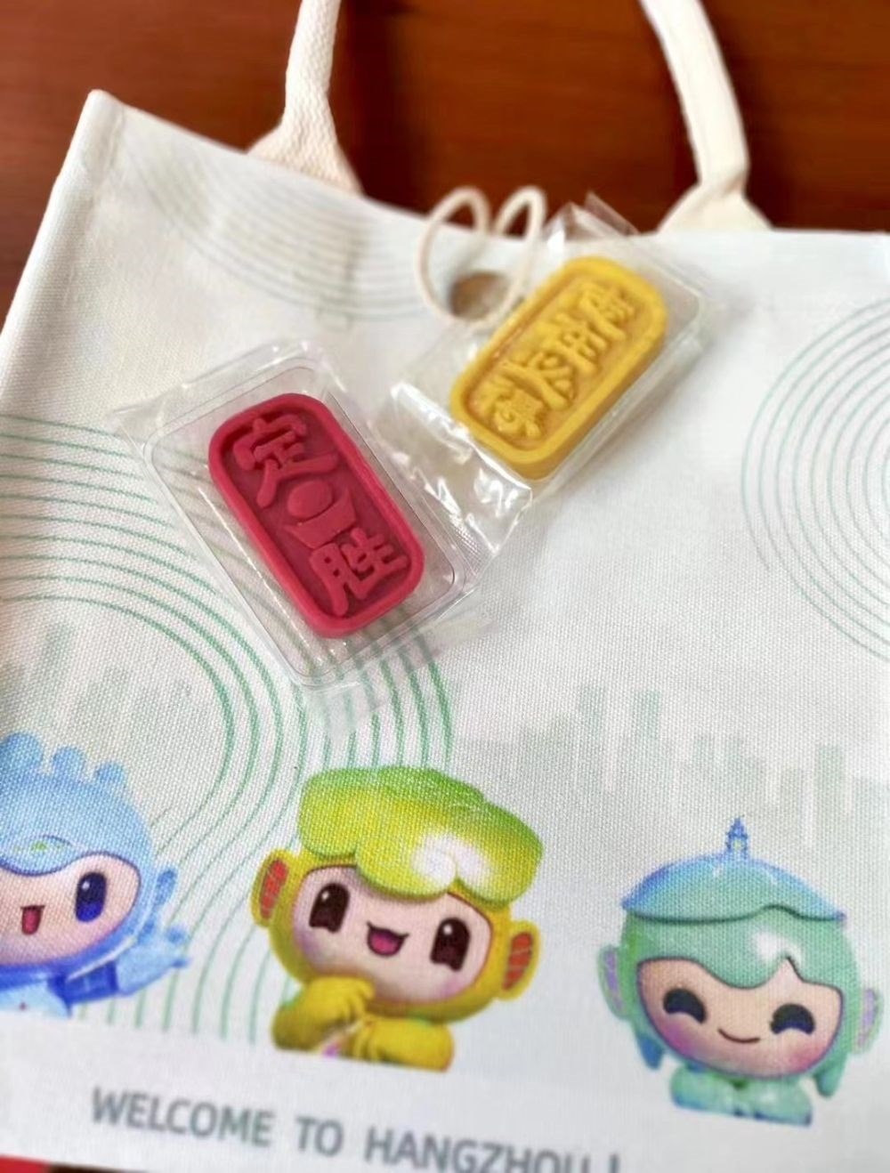 “志愿者們可以在手賬本上記錄志愿服務(wù)過程中的點點滴滴,留下美好的亞運回憶;特制的行李卡牌可以幫助他們標(biāo)記自己的物品和行李;而一紅一黃兩塊定勝糕上面分別寫有‘定勝’以及‘志在必得’的字樣,則是為他們加油打氣。”杭州亞運村人事與志愿者管理中心副主任、浙江外國語學(xué)院團委書記邱萍說。