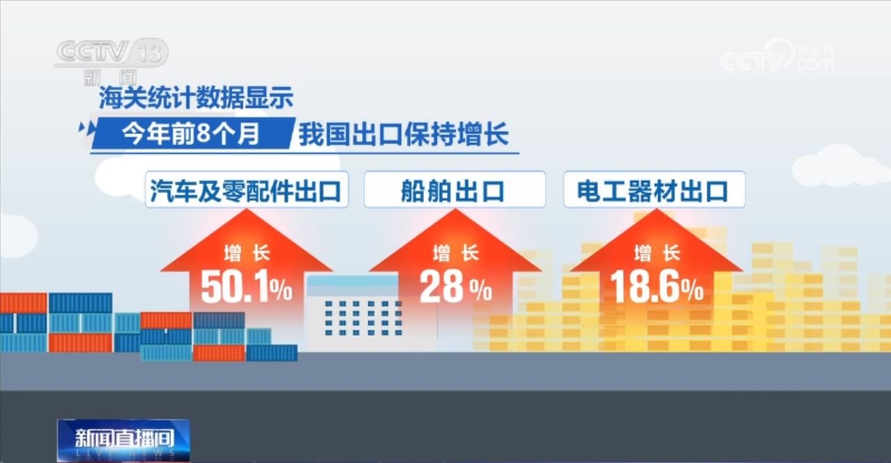 今年前8個月,我國出口保持增長。其中,機電產(chǎn)品出口8.97萬億元,同比增長3.6%,占同期我國出口總值的58%;汽車及零配件出口、船舶出口、電工器材出口分別增長50.1%、28%、18.6%。