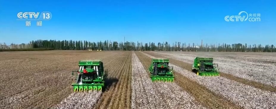 瑪納斯縣南靠天山山脈,土壤肥沃,光熱水土資源豐富,適宜種植棉花,是新疆的重要棉花產(chǎn)區(qū),也是國(guó)家級(jí)優(yōu)質(zhì)商品棉生產(chǎn)基地,今年當(dāng)?shù)孛藁ǚN植面積74萬(wàn)畝。在瑪納斯縣涼州戶(hù)鎮(zhèn)呂家莊村的萬(wàn)畝棉田里,三臺(tái)新引進(jìn)的棉花采收打包一體機(jī)正在采收棉花,采棉機(jī)能夠高效快速地將棉花從棉稈上脫離,采凈率高達(dá)95%以上,一臺(tái)采棉機(jī)平均每天可采收700多畝棉花,相當(dāng)于1000名拾花工勞動(dòng)量的總和。