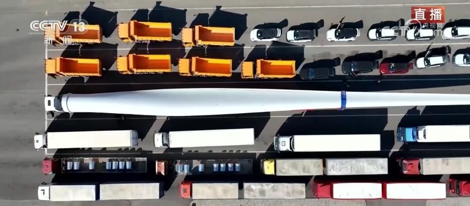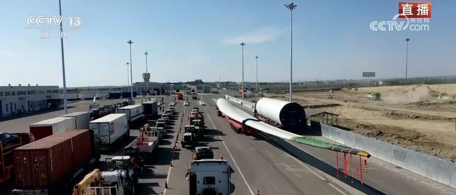 看這邊。大家知道這個(gè)龐大的家伙是什么嗎?它是風(fēng)力發(fā)電機(jī)上的一個(gè)扇葉。根據(jù)不同型號(hào),短的扇葉有三四十米,長的有七八十米,龐大的塊頭也讓它在出口貨物中格外亮眼。它的這種“出”,出的不僅僅是設(shè)備,還有帶著“中國技術(shù)”的風(fēng)電項(xiàng)目。中亞地區(qū)有非常豐富的風(fēng)力資源,來自中國的風(fēng)電項(xiàng)目、風(fēng)電技術(shù)正全面助力共建“一帶一路”國家的綠色能源發(fā)展。當(dāng)?shù)卣秃jP(guān)還專門將出境通道拓寬了半米,讓這種超寬、超長的大型設(shè)備能夠順利出境。