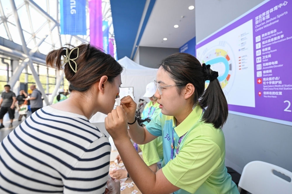 9月26日,浙江杭州淳安界首體育中心自行車館場(chǎng)館志愿者為前來(lái)觀賽的觀眾貼上加油助威貼紙。新華社記者 胡虎虎 攝