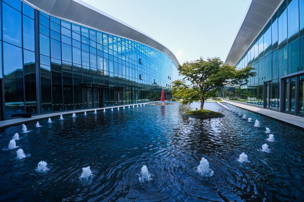 這是杭州富陽(yáng)水上運(yùn)動(dòng)中心的中庭花園(8月24日攝),水池中的水來(lái)自于循環(huán)利用的雨水。新華社記者 徐昱 攝