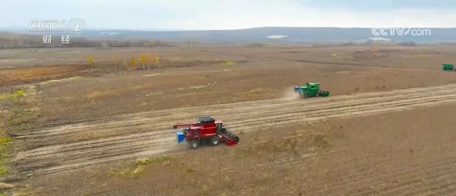 在黑河市遜克縣干岔子鄉(xiāng)的大豆收獲現場,金燦燦的大豆種植田連綿成片,三臺大型收割機在田間來往縱橫,井然有序。伴隨著機器的轟鳴聲,收割機將大豆收割、脫粒,然后依次轉到旁邊等候的運輸車運走。在收獲大豆的同時開展秋整地工作,兩臺大型拖拉機牽引著深松機,把收割完的土地進行深翻,改善耕地質量。